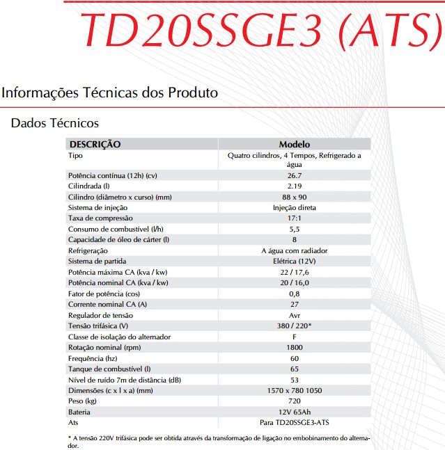 Descrição:Grupo Gerador Toyama, Equipado com motor de 26,7CV, partida elétrica, trifásico, Potência Máxima de 22,0 KVA e Potência Nominal de 20,0 KVA, equipado com tanque de 65 litros, baixo nível de ruído somente 53dB a 7 metros de distância. Esta versão TD20SSGE3-ATS é equipada com painel de automação, que ligada ao quadro elétrico da residência, comércio ou indústria aciona o gerador automaticamente em caso de queda de energia. >>>>Ficha técnica |