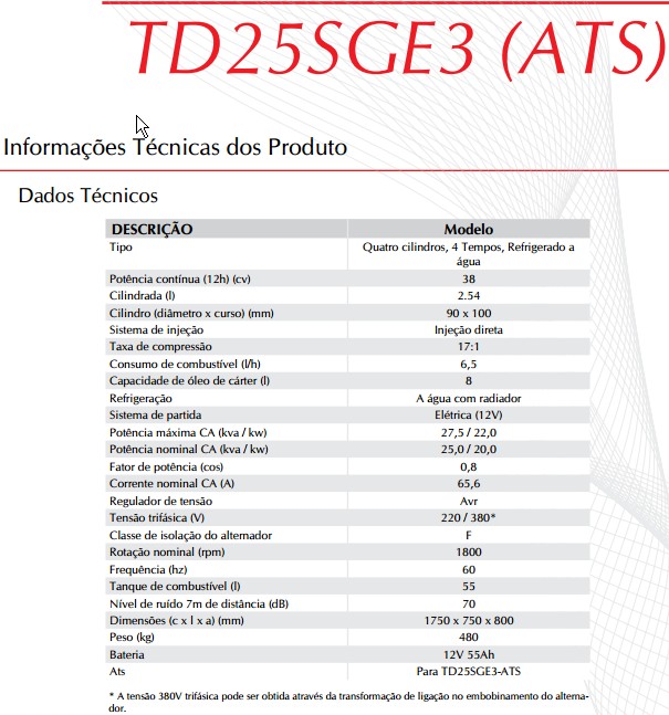 Descrição: Grupo Gerador Toyama, Equipado com motor de 38CV, partida elétrica, trifásico, Potência Máxima de 27,5 KVA e Potência Nominal de 25,0 KVA, equipado com tanque de 55 litros, baixo nível de ruído somente 70dB a 7 metros de distância. >>>>Ficha técnica |